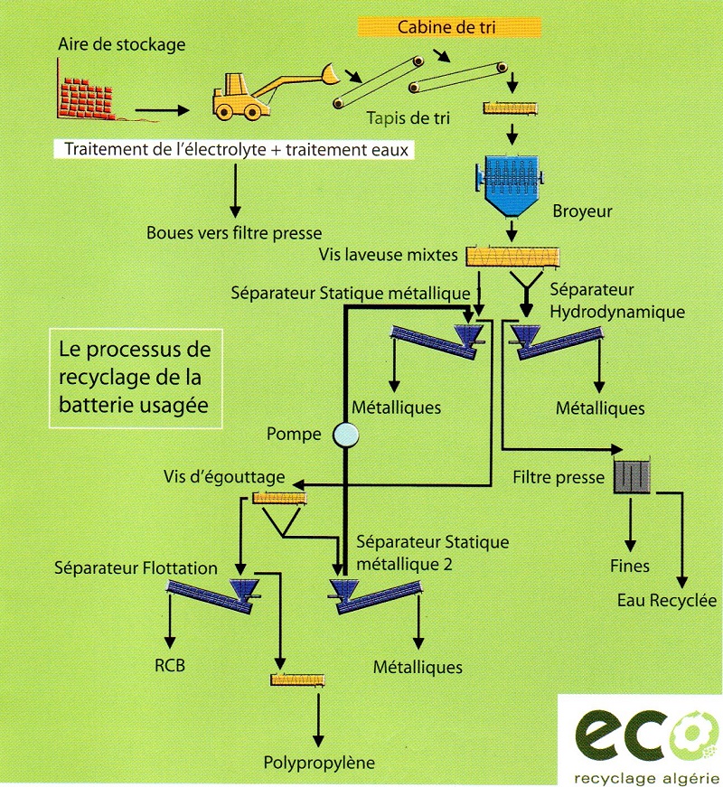 Les unités de traitement ECO RECYCLAGE reçoivent des batteries entières, les broient et les trient, les matières plombeuses, oxydées, les parties métalliques, le polypropylène sont exporté et les autres matières plastiques non recyclables sont mises en centre d'enfouissement technique.